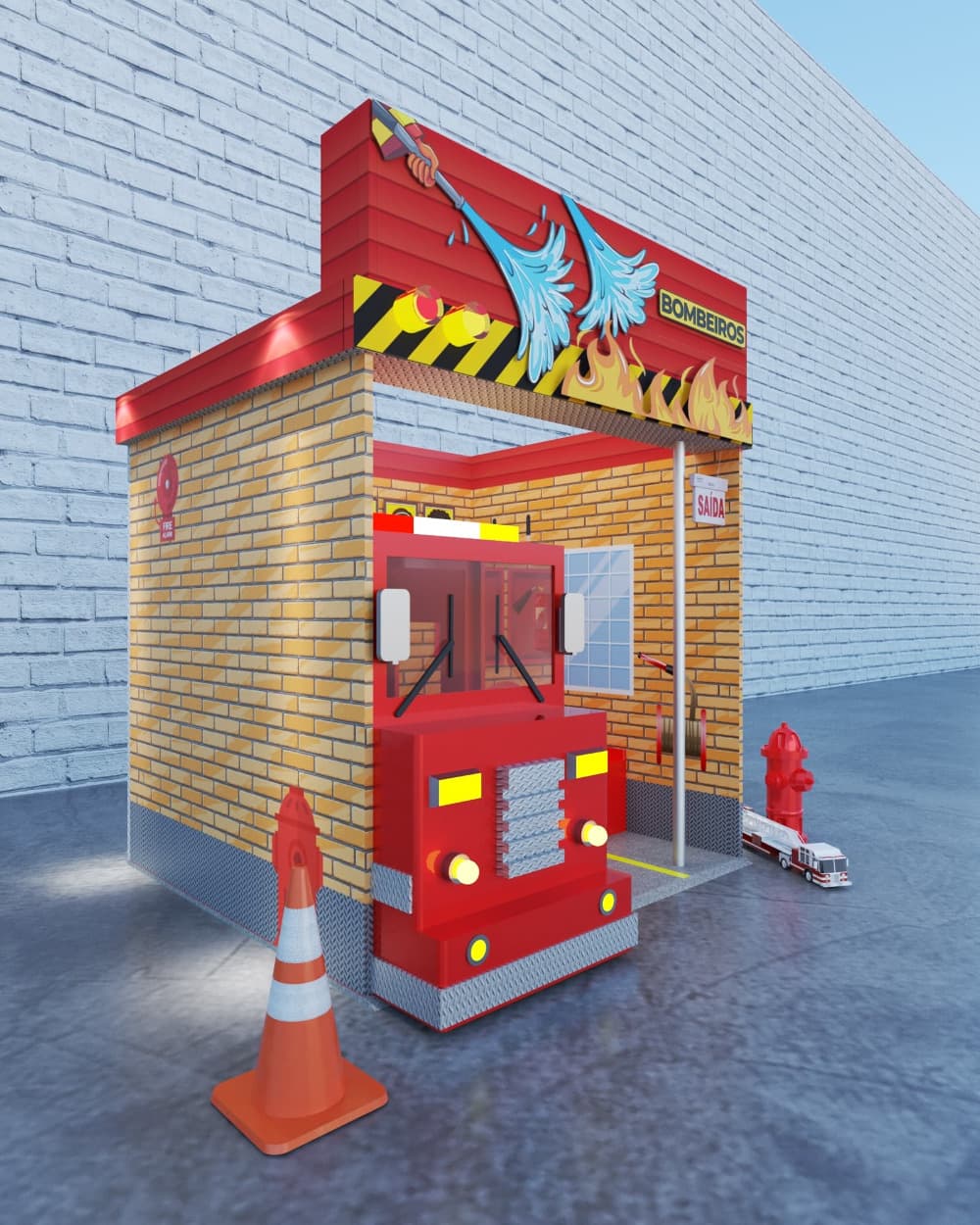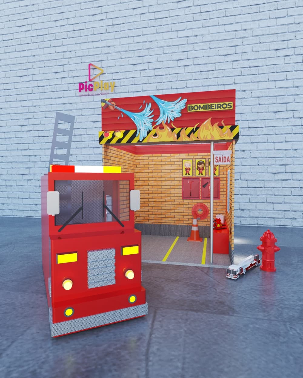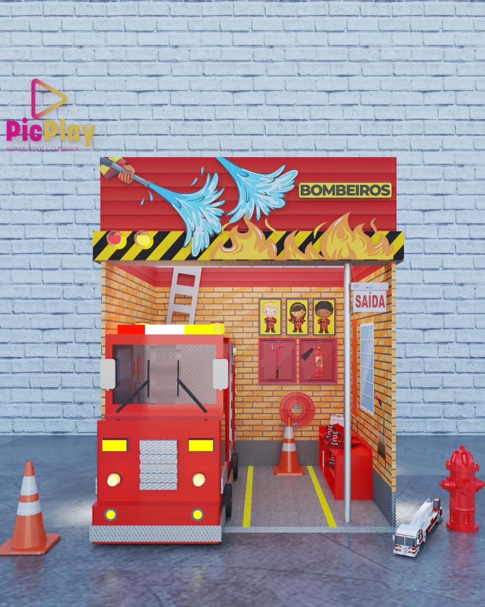 O tema de bombeiros é sucesso garantido entre a criançada e este cenário, além de permitir muita interatividade, causa grande impacto com o caminhão com duas áreas de brincar, poste (a barra de ferro vertical, também conhecida como biju) e vários outros recursos.