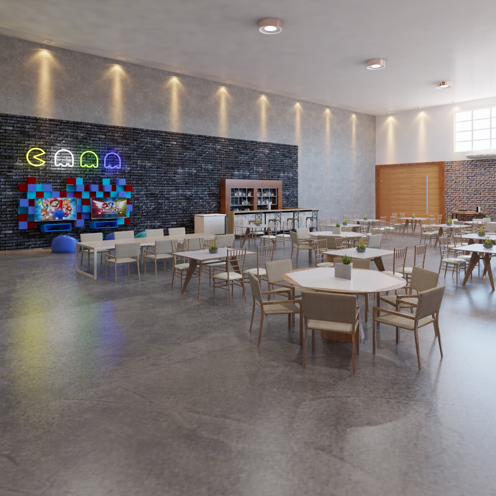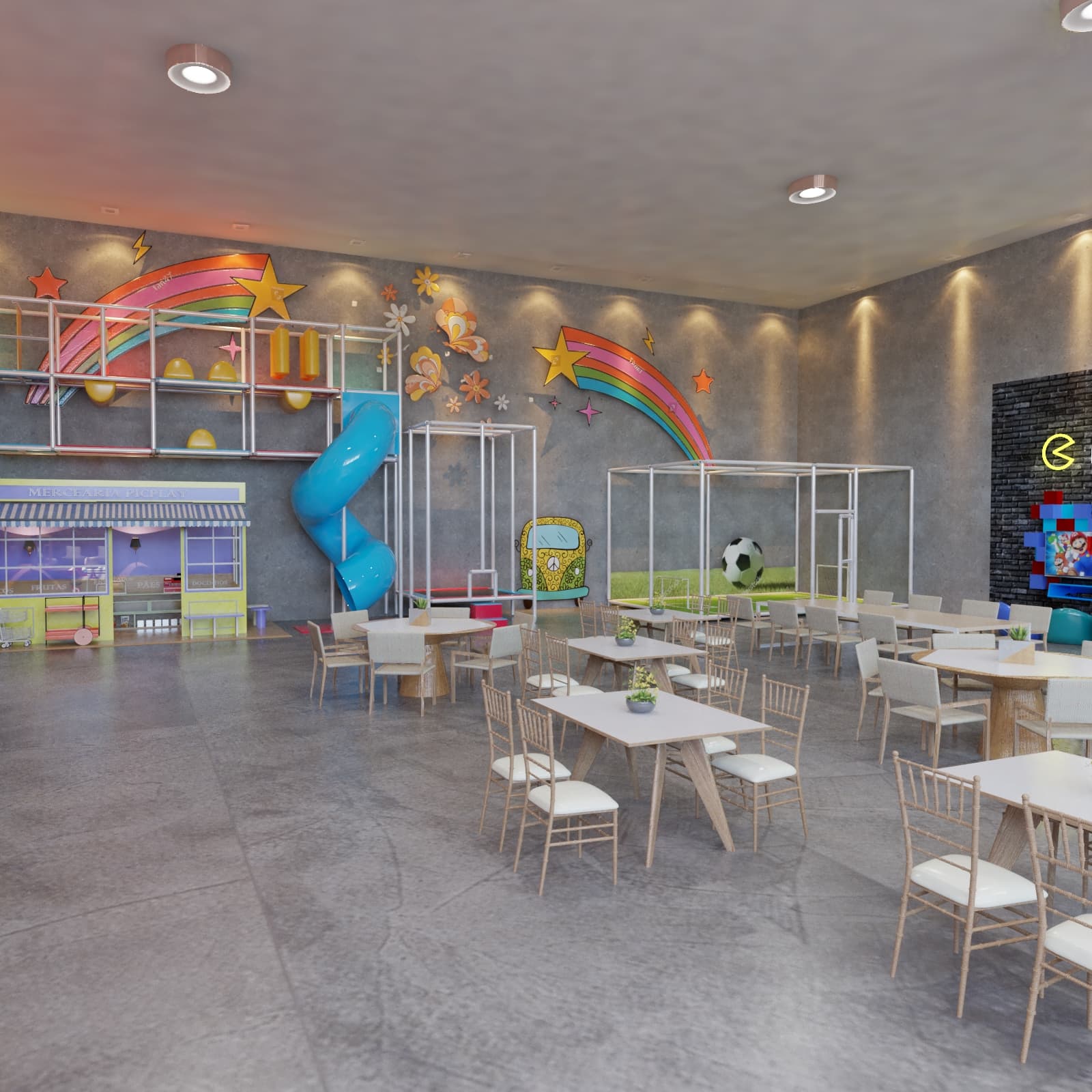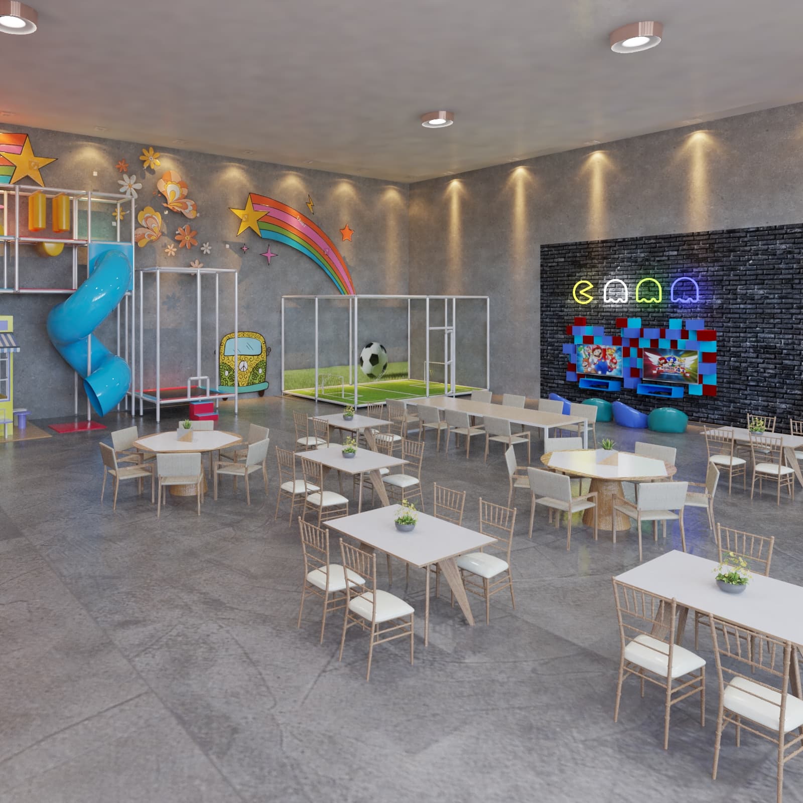 Esse projeto contempla toda construção do buffet infantil, com produtos de alto padrão, área baby, espaço gamer, um super brinquedão, cama elástica, campo de futebol, escorregador espiral, área do bar, lounge, área do parabéns e todo esse pacotão de diversão integrado com o projeto elegante do espaço.