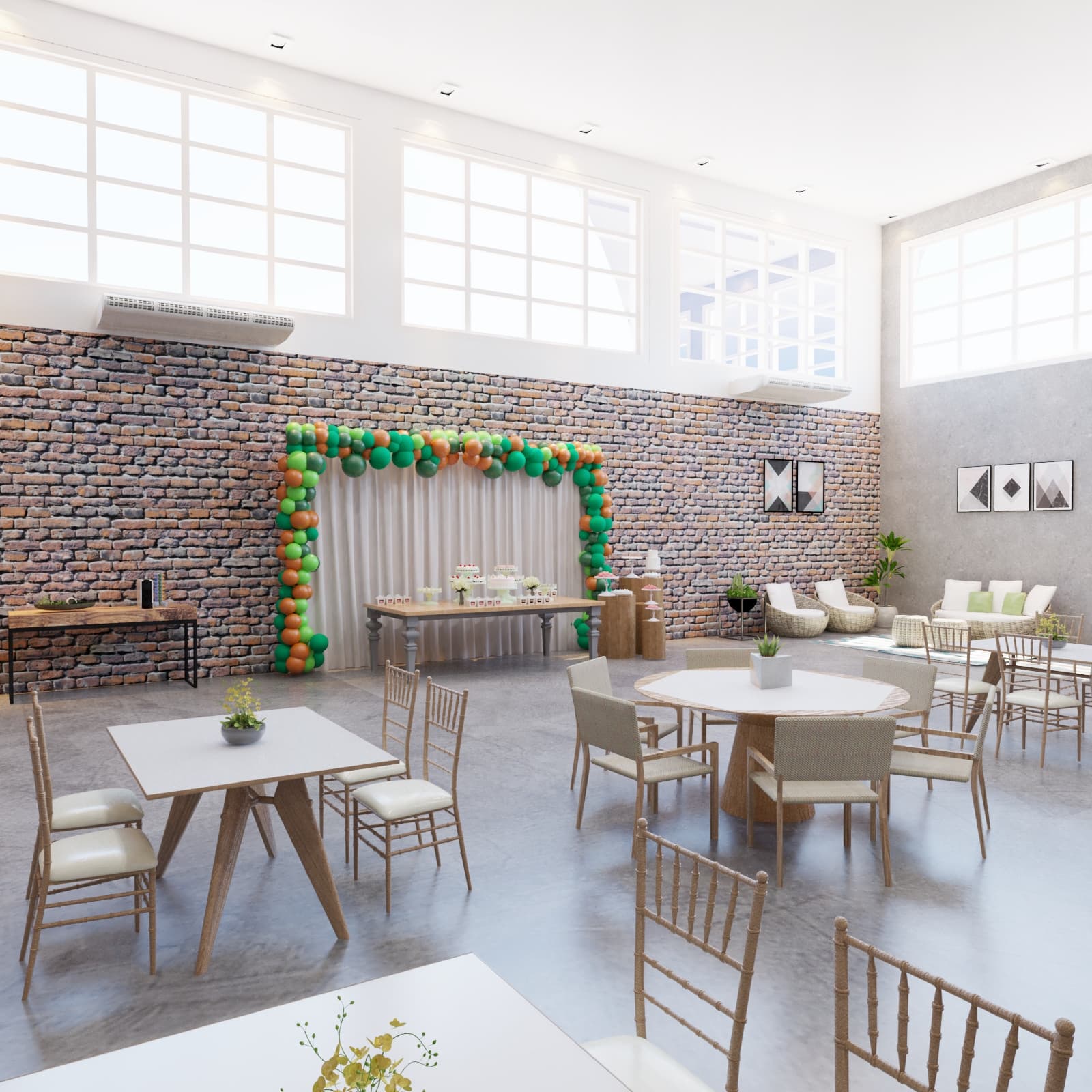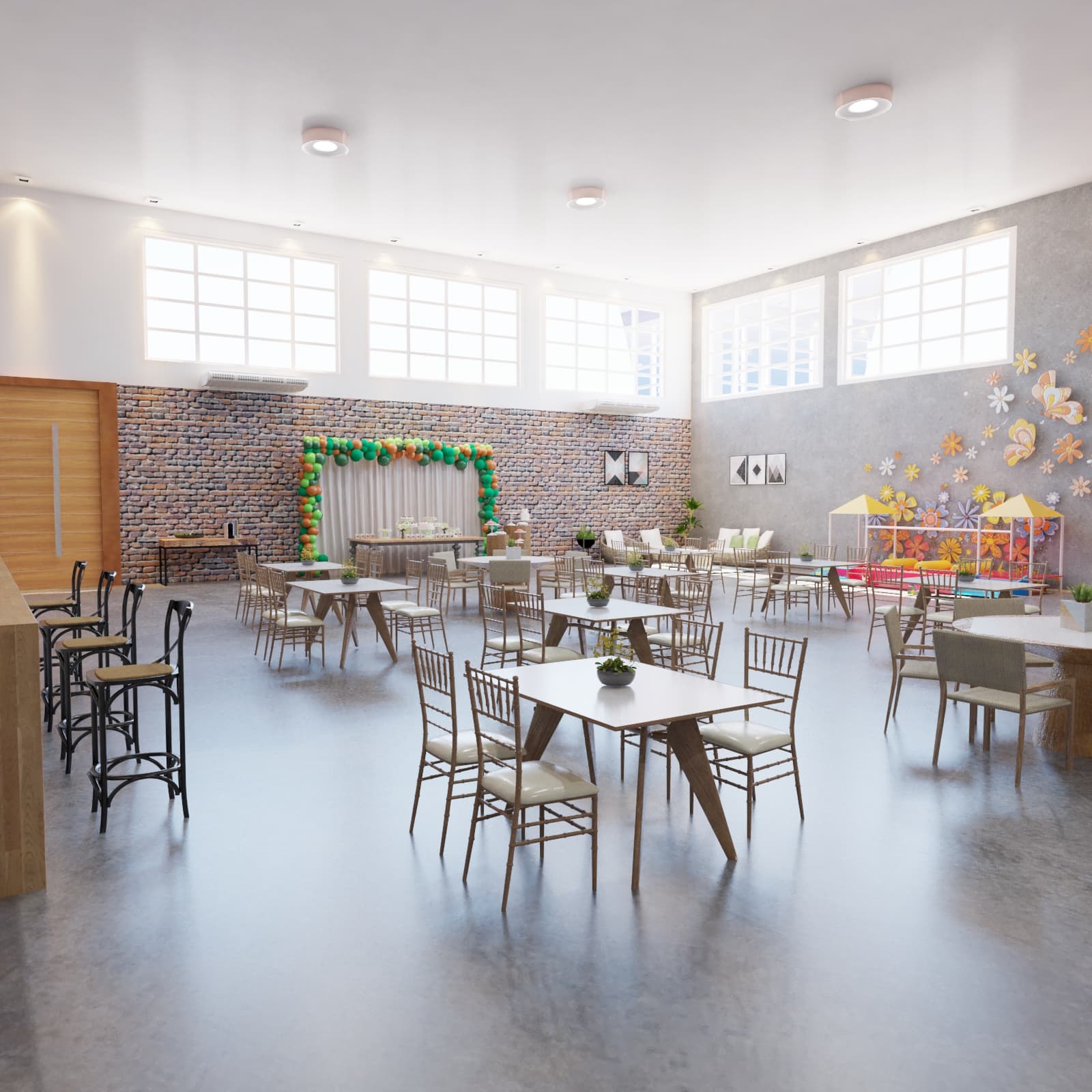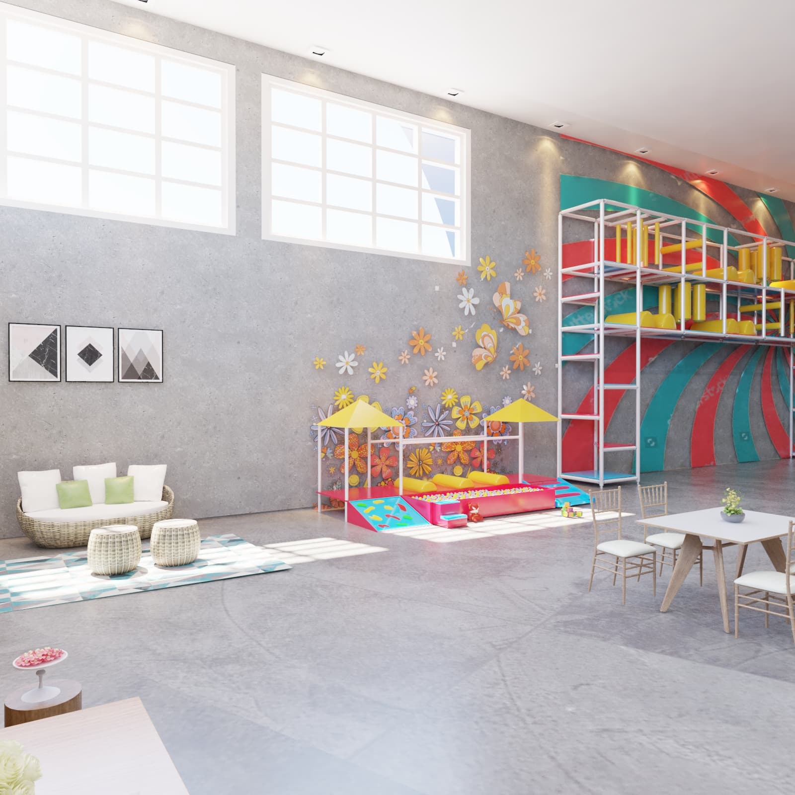 Esse projeto contempla toda construção do buffet infantil, com produtos de alto padrão, área baby, espaço gamer, um super brinquedão, cama elástica, campo de futebol, escorregador espiral, área do bar, lounge, área do parabéns e todo esse pacotão de diversão integrado com o projeto elegante do espaço.