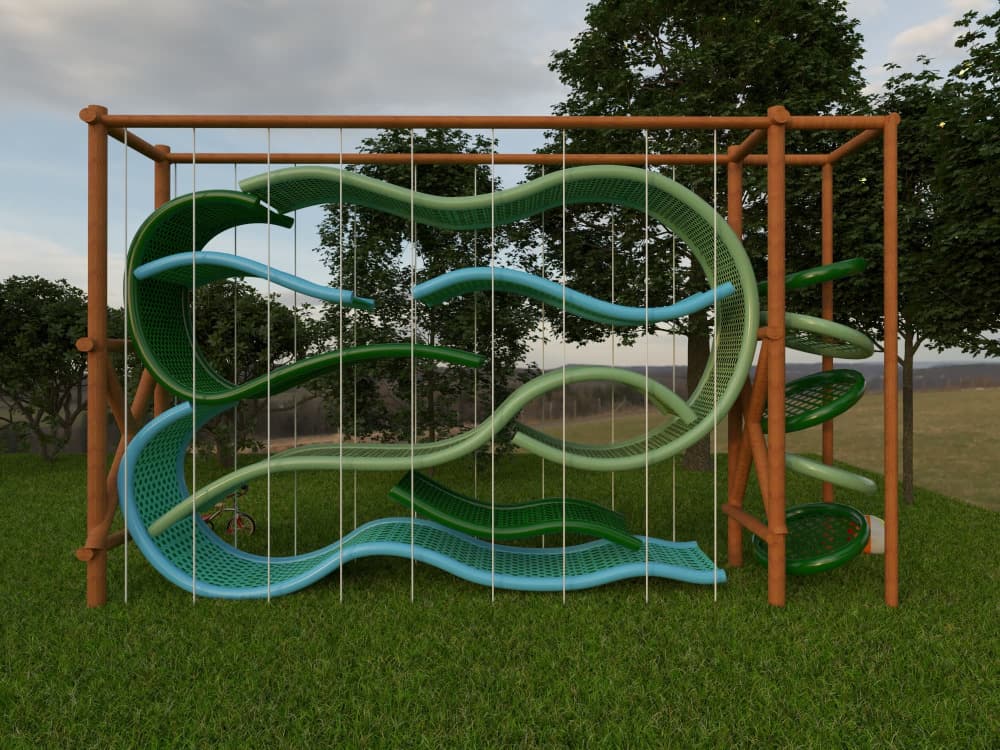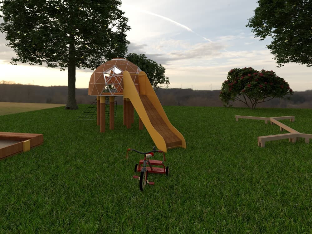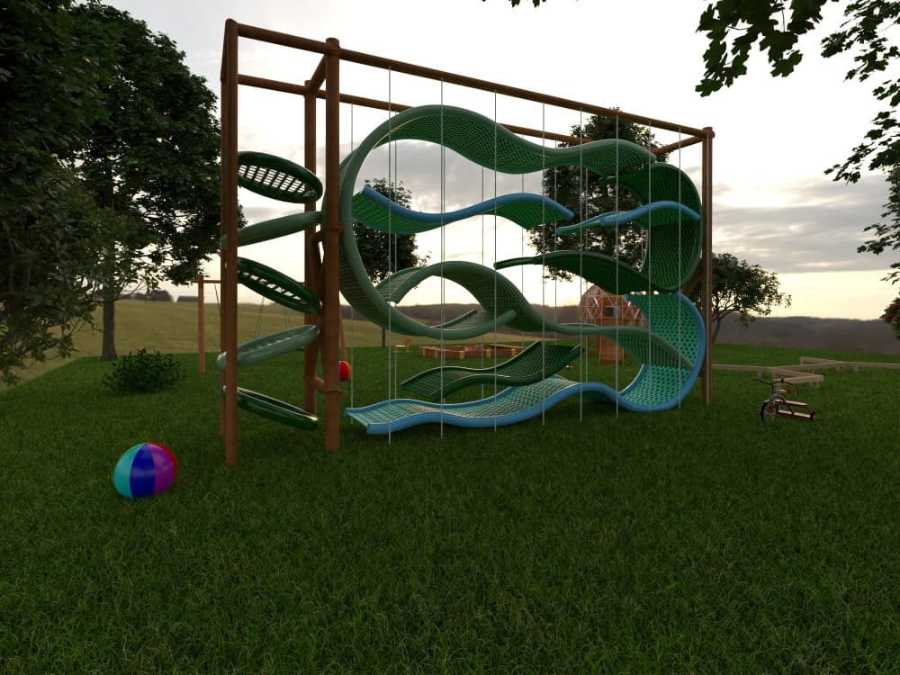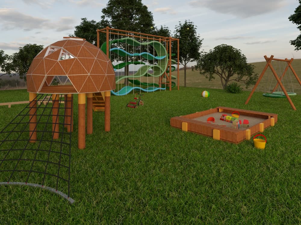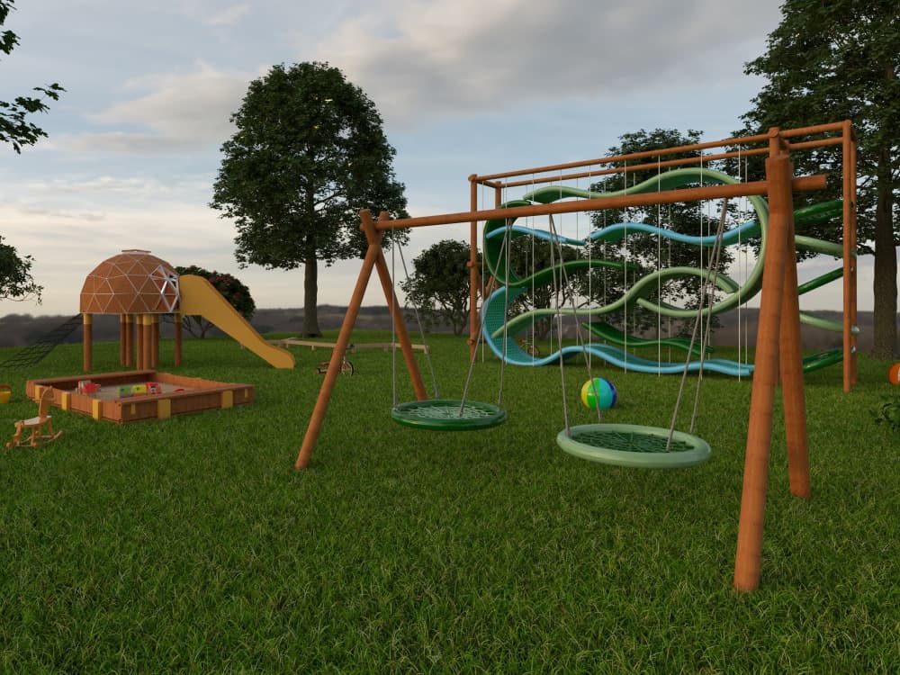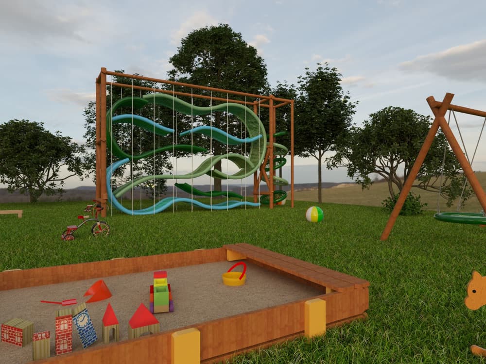 Esse projeto contempla uma área baby com tanque de areia, circuito de curvas de fitas, caminho de equilíbrio, balanços e domo com escorregador.